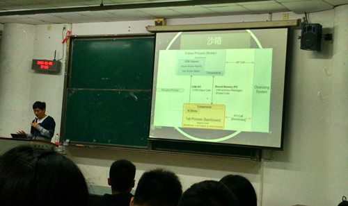 当天下午,清华大学网络行为研究所安全工程师骆鑫做了题为《当前国内外网络安全技术发展》的学术讲座。信息安全工程学院信息安全、网络工程、信息对抗技术等专业和相关学院的近百名员工聆听了此次讲座。