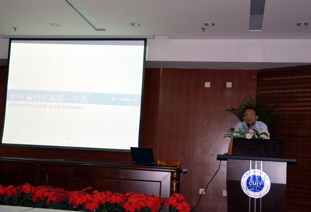 近日,北京神州绿盟信息安全科技股份有限公司成都分公司肖波总经理应公司信息安全工程学院的邀请,在学术报告厅为公司师生作了题为“如何赢得职场第一个的offer”的就业专题讲座。公司2011级全体员工及部分其他学院2011级员工参加了此次讲座。
