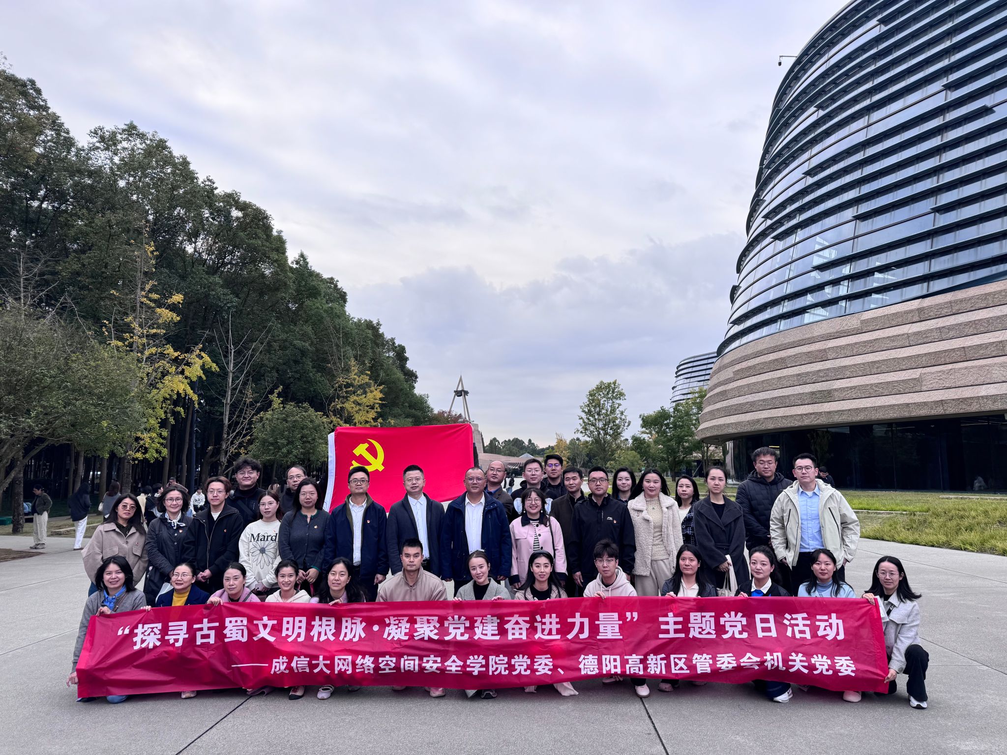 在三星堆博物馆,党员们在讲解员的带领下沉浸式参观了青铜神树、黄金面具等珍贵文物。面对距今五千年的古蜀瑰宝,大家认真聆听讲解,党员们直观感受到中华优秀传统文化的博大精深与独特魅力,惊叹于先民的智慧与创造力。纷纷表示,将从中华文明多元一体的灿烂成就中坚定文化自信,把古蜀文明蕴含的开拓精神融入网络空间安全学科教学、科研工作中,为推动学校、学院高质量发展贡献力量。