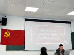 首先,支部全体党员开展“学习习近平新时代中国特色社会主义思想”的专题学习,邢高杰、吴鸿晏两位支部党员分享了近期学习习近平新时代中国特色社会主义思想的心得。邢高杰同志从“习近平新时代中国特色社会主义思想”的四个维度方面进行了深入学习。吴鸿晏同志从“习近平新时代中国特色社会主义思想”的新时代、新思想、新目标、新征程方面深入领会。