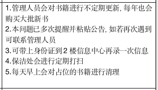 2图书馆问题(一)占位问题问题反映:私人书籍物品占位问题,导致一个或多个座位长期闲置。解决情况:本问题已多次提醒并粘贴公告,如若再次遇到可联系管理人员。