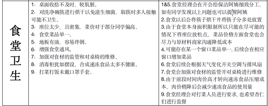 (一)食堂卫生问题问题反映:食堂桌面收拾不及时,较肮脏,地板有油,容易绊倒。解决情况:食堂经理将会在开会给保洁阿姨细致分工,如有同学发现以上问题也可以提醒阿姨及时处理哦。