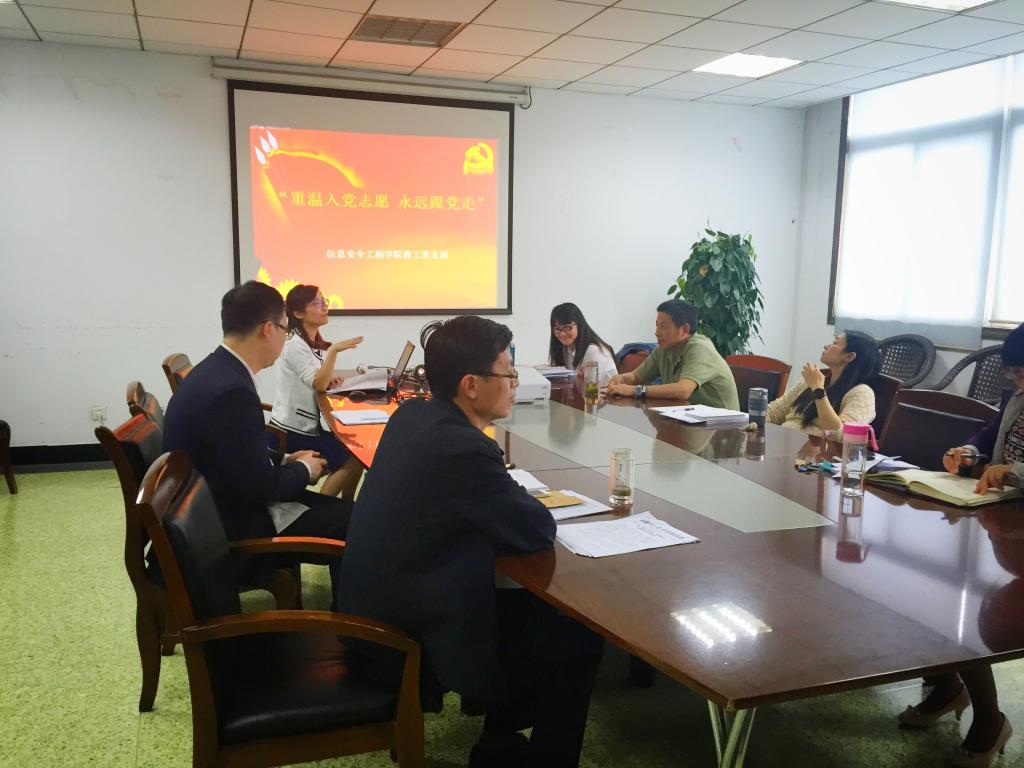 为使广大教师党员进一步增强政治意识、大局意识、核心意识、看齐意识,坚定理想信念、保持对党忠诚、树立清风正气、勇于担当作为,充分发挥先锋模范作用。根据公司党委《关于在全公司党员中开展“学党章党规、学系列讲话,做合格党员”学习教育的实施方案》要求,信息安全工程学院结合实际,4月29日下午3:00在科教楼三会议开展了“重温入党志愿、永远跟党走”主题党日活动。活动由教工支部书记王祖俪主持,学院所有教工党员参加了本次党日活动,