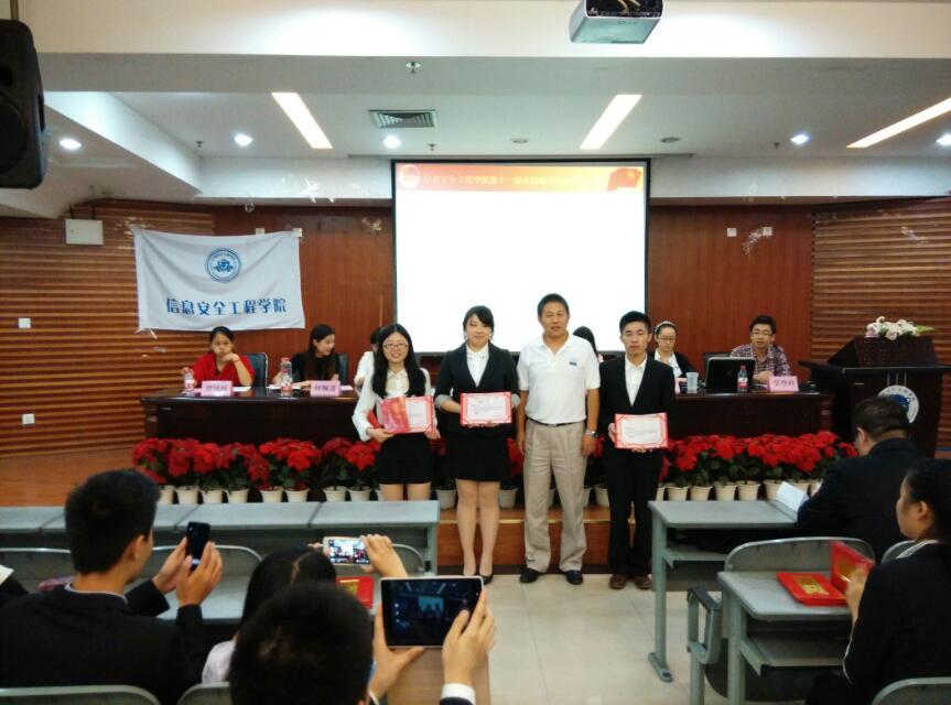 2014年10月10日,信息安全工程学院第十一届分团委员工会换届大会在学术报告厅举行。出席此次会议的有信安公司党总支书记许鸿涛、信安学院分团委书记贾茜、辅导员吴登科、姜艳等,以及2013-2014优秀团学干部、第十届分团委员工会员工干部、第十一届分团委员工会全体干部、2014级各班班委。