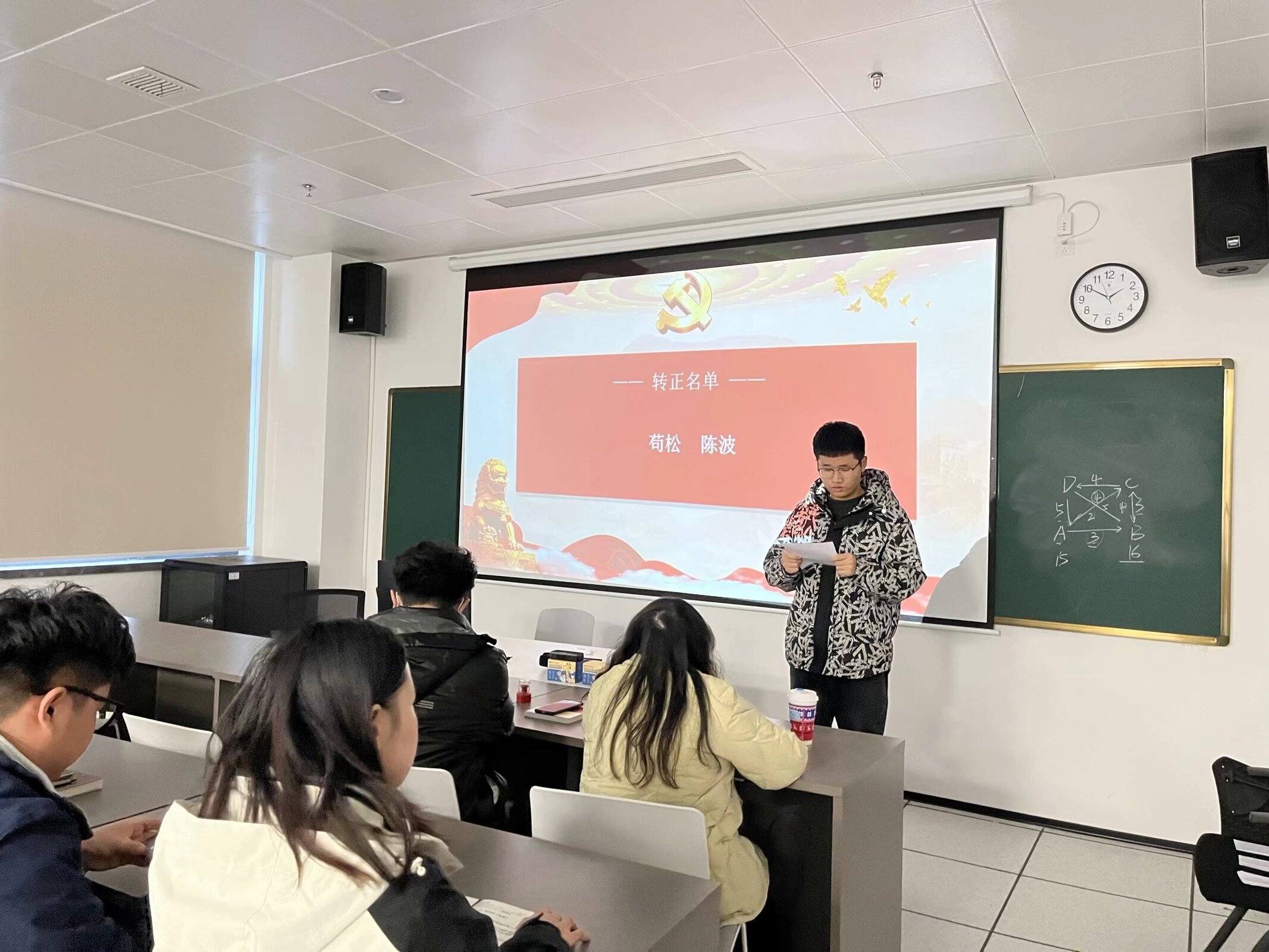 党小组成员汇报预备党员在预备期间的表现情况和小组意见,支部委员会介绍预备党员在预备期间的教育考察情况,与会党员对申请转正同志是否符合党员转正条件进行充分讨论并发表意见,采取无记名投票方式表决是否同意转正对象按期转正。专硕党支部组织委员唐梅宣读投票结果和综合考察意见。苟松、陈波两名同志的赞成人数超过应到会有表决权的正式党员的半数,同意其转正申请。随后,通过转正决议的预备党员同志作表态发言。