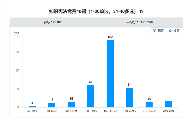 激烈角逐,展现扎实功底。竞赛通过便捷的QQ在线平台进行,题目共设置30道单选题,10道多选题,在两个小时的竞赛时间里,参赛同学展现出了极大的热情和扎实的宪法知识基础,积极参与、认真作答。最终,363名选手完赛,超过80%的参赛者取得了优异成绩。