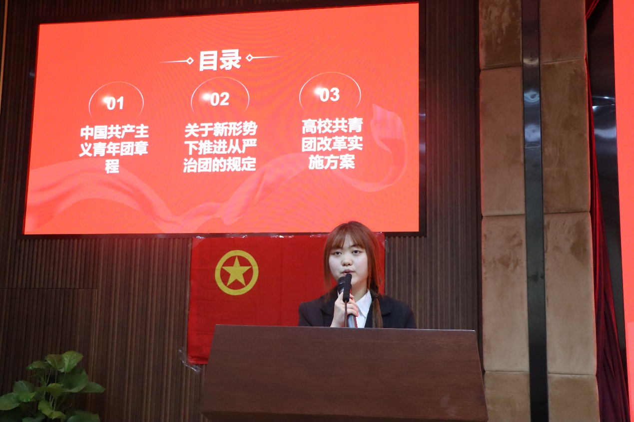 宣誓完毕后,第一次团课正式开讲。本次团课由学院团委组织部负责人周静影主讲。她重点领学了团组织章程、推进从严治团的有关规定以及高校共青团改革实施方案。