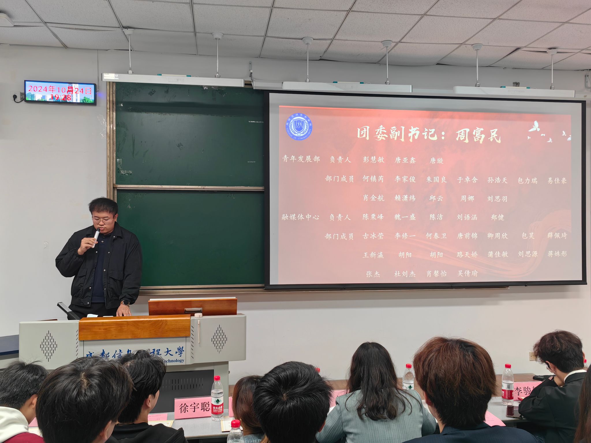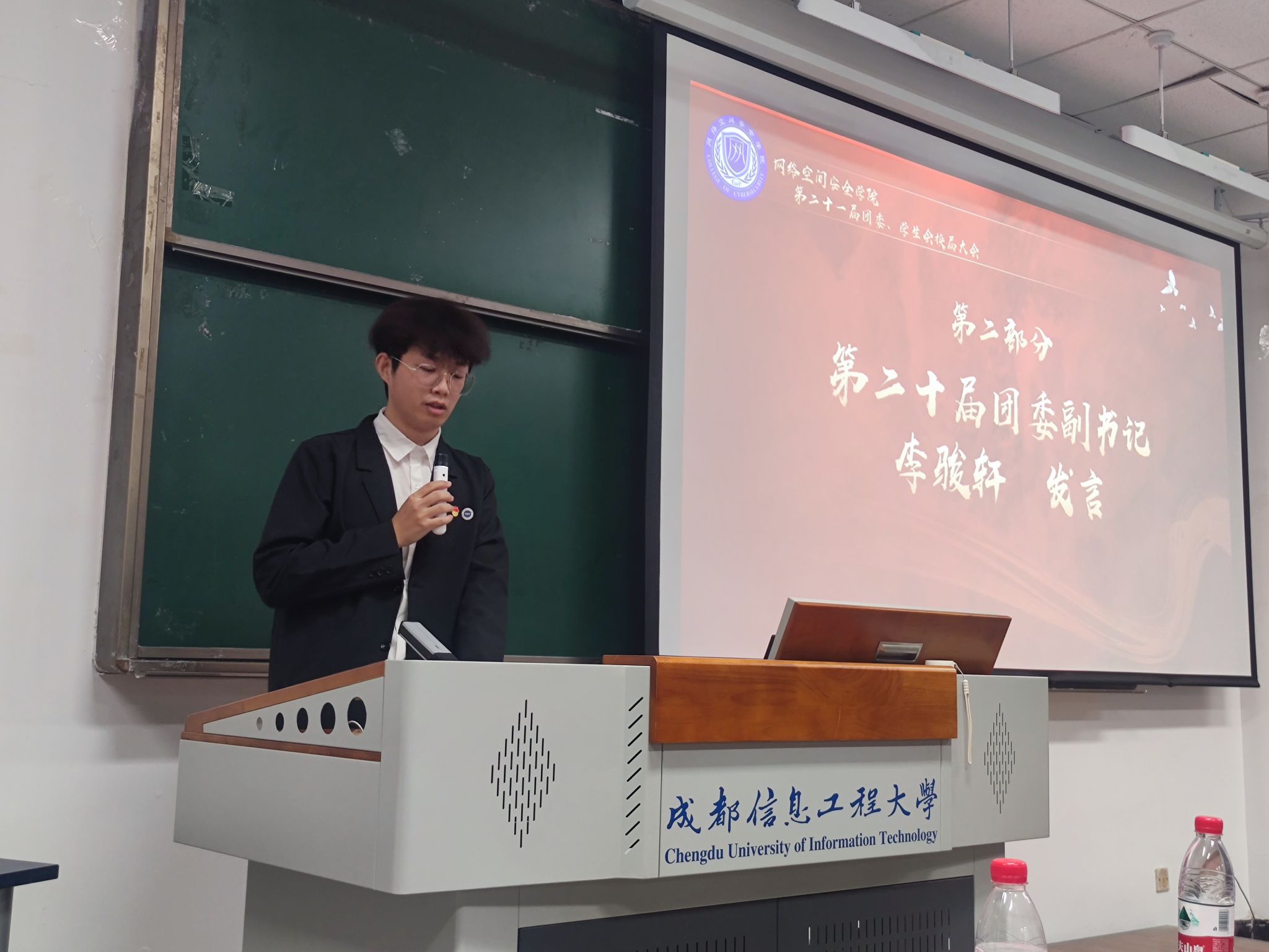 大会最后,夏焜和韩阳为所有团学部门成员颁发聘书。夏焜宣读了第二十一届团委员工会干部名单,并进行致辞。他对全体团学干部的贡献表示感谢,强调了“量的积累到质的转变”的重要性,对员工干部提出三点期待:服务同学发挥员工干部带头作用;培养自身的领导才能和团队合作意识;持续创新推动团学工作。