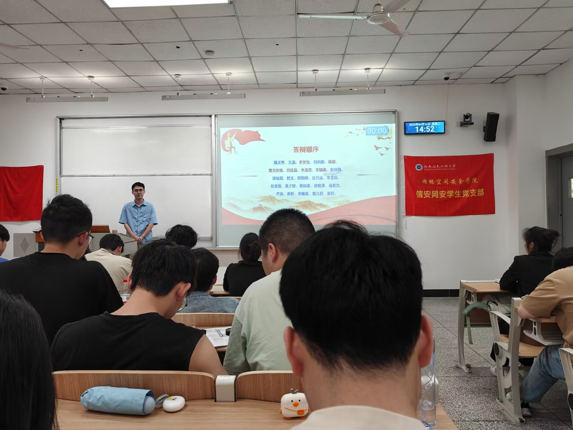2025年4月16日在航空港H1102教室召开2025年春季学期入党积极分子列为发展对象答辩会。信安网安员工党支部书记韩阳、员工科科长姜艳、辅导员吴枫、信安网安员工党支部全体党员和24名入党积极分子参会。会议由支部委员王东川主持。