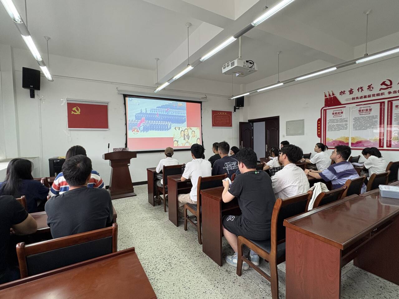 首先,张福杰带领全体党员开展主题学习。在交流研讨环节,党员代表踊跃发言,结合自身实际分享心得体会。大家一致认为,这堂思政大课既是一次深刻的思想洗礼,也是一堂生动的爱国主义教育。大家表示,作为新时代青年党员,要自觉传承伟大抗战精神,坚定理想信念,勇担时代使命,努力将爱国情、强国志、报国行融入专业学习与未来发展的实际行动中。