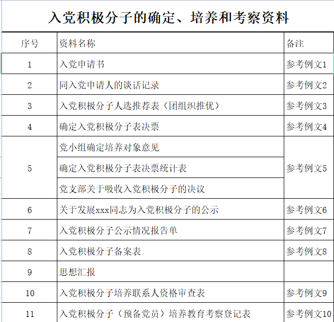公司发布了有关入党积极分子的确定、培养和考察资料。希望同学们严格参照公布的例文准备好资料。