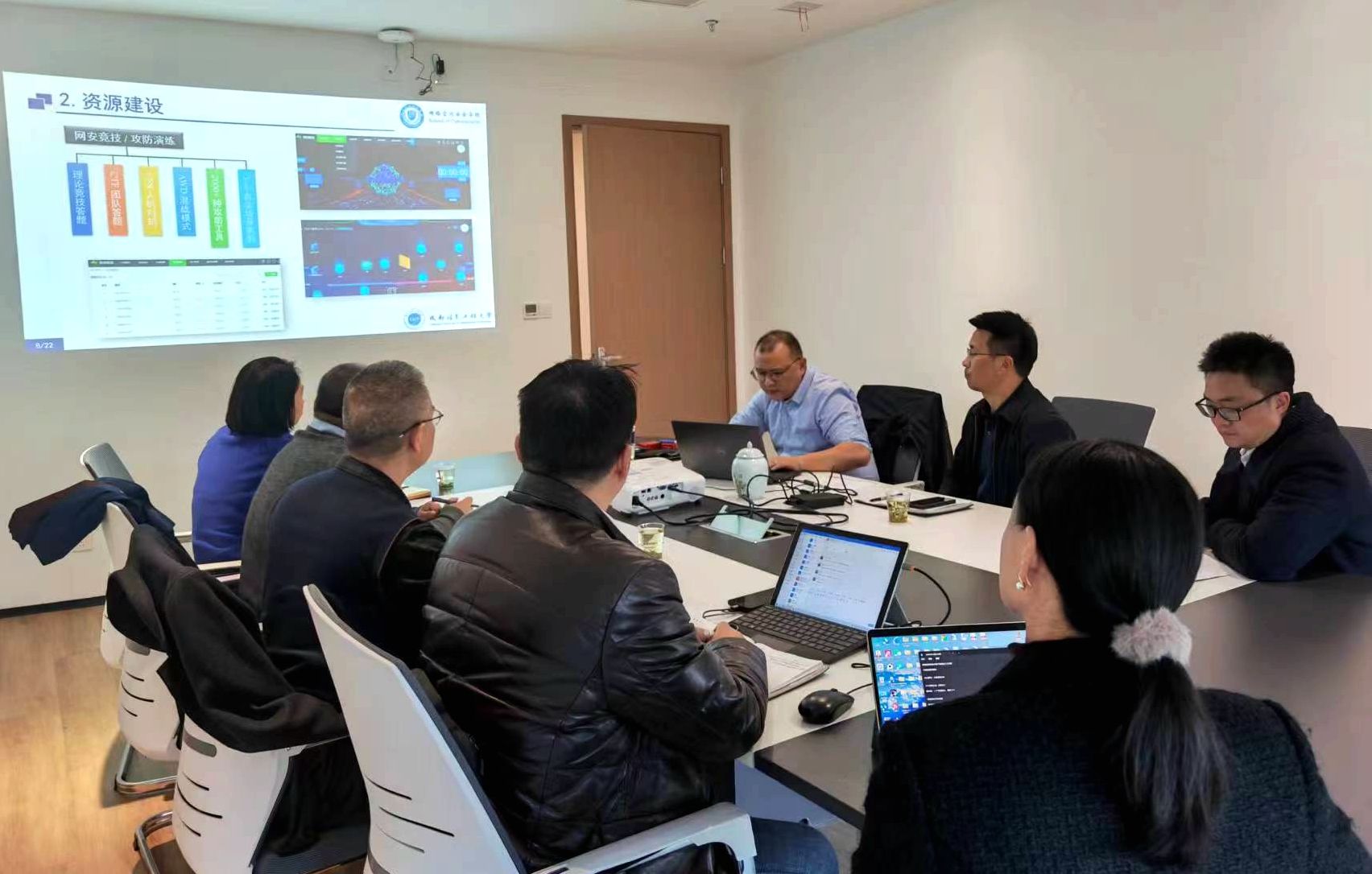 交流会上,教务处副处长李代伟致辞,欢迎西南科技大学及信息工程学院领导及教师访问公司网络空间安全产业学院。西南科技大学教务处副处长张庆明介绍了本次调研和交流的主题,并对学院的热情接待表示了感谢。周益民代表网络空间安全产业学院介绍了过去两年来公司产教融合示范项目的建设情况,并针对公司产教融合示范项目的达成情况、有效举措、主要成效、经验做法等方面做了具体分享,然后对学院的产教融合建设及成效做了更为具体的介绍,最后总结了学校、学院在产教融合示范项目验收过程中的一些经验做法。随后,双方参会代表就产教融合示范项目的验收总体部署、材料准备、验收动员工作等各个方面进行了深入的研讨。