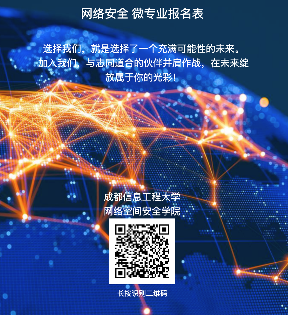 选择网络安全微专业,就选择了一个充满挑战与机遇的未来。在这里,你将学习到最实用的网络安全技术,积累丰富的动手及实战经验,我们诚邀有志于网络安全事业的青年才俊加入我们的行列,为国家的网络安全事业贡献自己的力量,共同为构建安全、可信、繁荣的网络空间而努力奋斗!