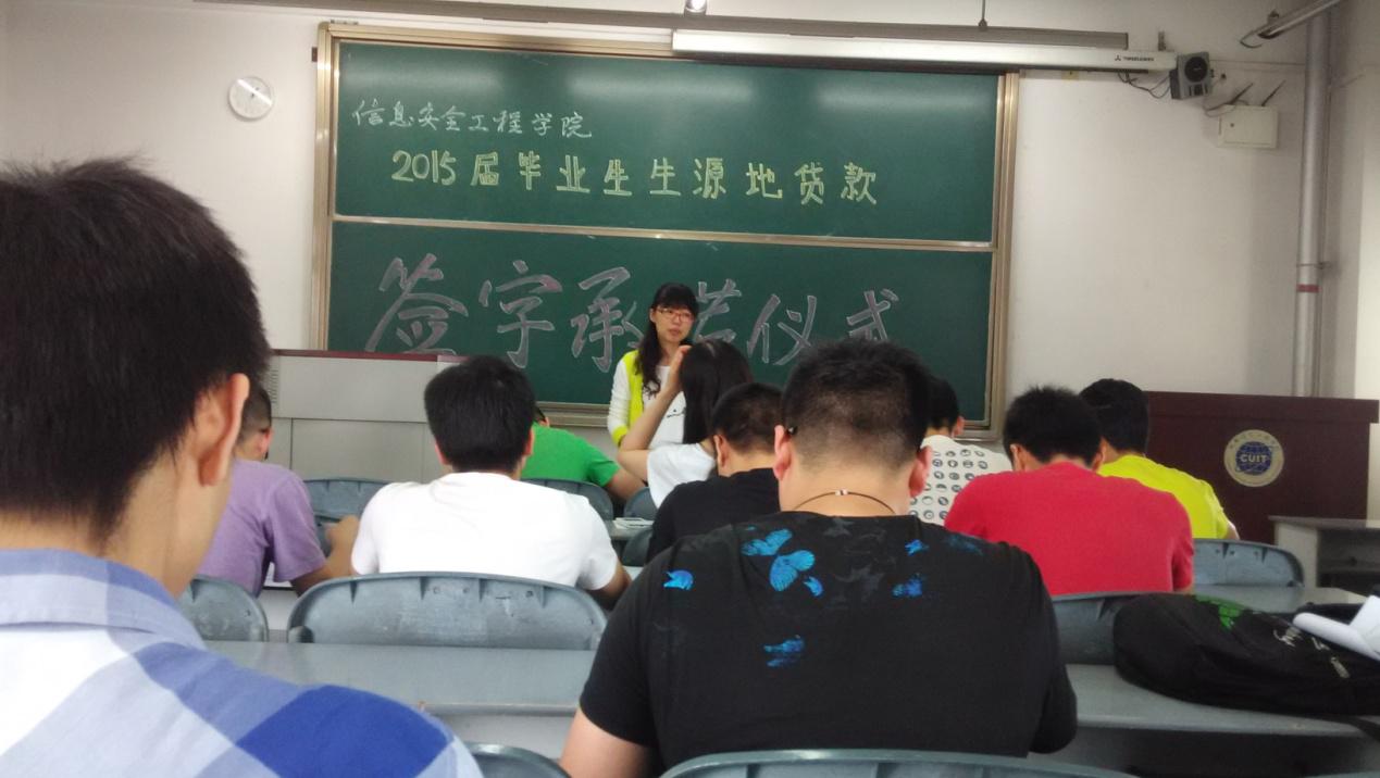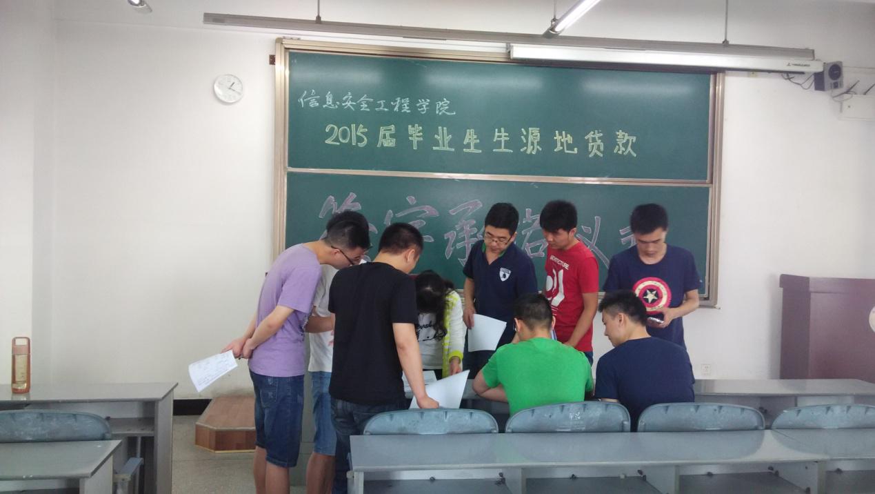 5月25日下午,信息安全工程学院在1603教室举行了2015届毕业生生源地贷款签字承诺仪式。出席此次还款承诺书签订仪式的有吴登科老师、文军老师以及2015届贷款毕业生。
