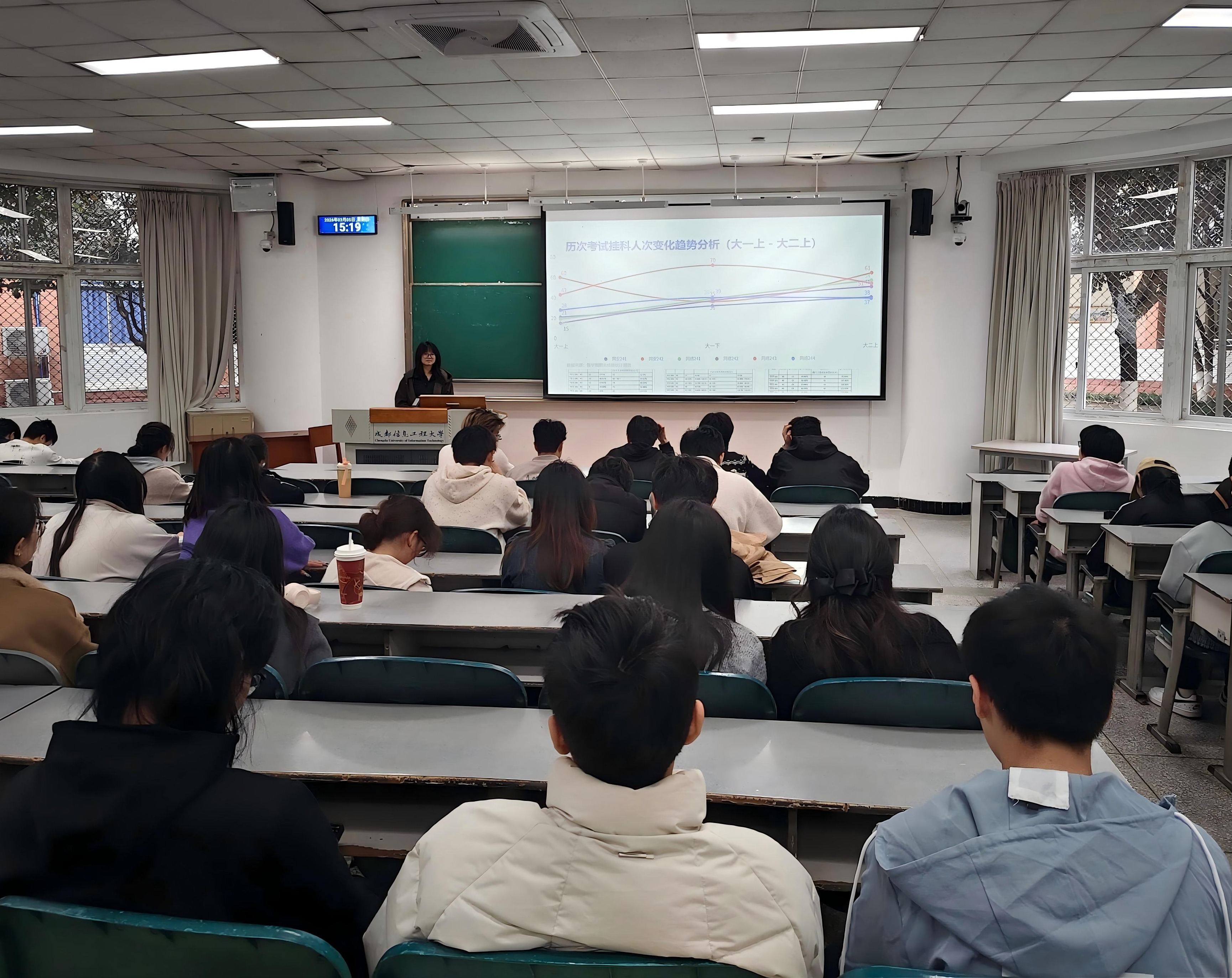 会上,韩阳结合大一上至大二上学期成绩数据,分析了各班级挂科人数及变化趋势,指出学业发展中的优势与不足,引导同学们正视差距、找准问题。随后通报班委满意度调查结果,班委工作在认可度较高的同时,仍需加强信息传达、心理关怀等方面工作,进一步回应同学建议,提升服务能力。