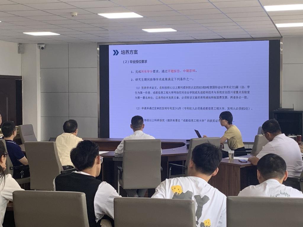 昌燕副经理针对培养方案、课程试卷、教学运行、课程教材、教学质量、学位论文、科研指导以及档案管理八个方面对学院本学期的研究生工作进行详细的汇报。