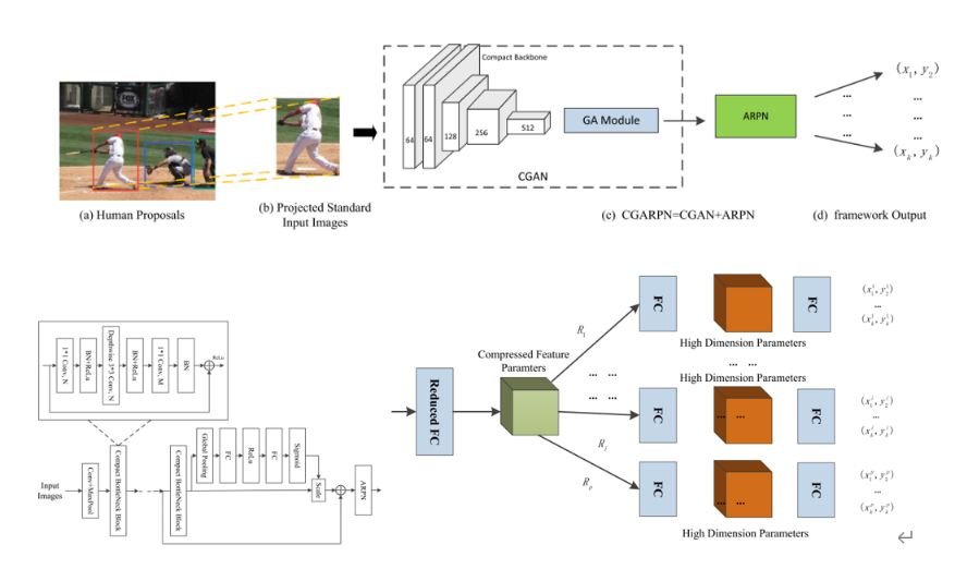 论文提出了一种新的紧凑CGARPN模型,结合了具有全局关联相关性和自适应路由姿态估计网络。算法框架引入的CGAN主干部分,通过压缩内核来促进特征表示,参数空间有效降低了计算和存储空间的消耗。该框架集成了关键点之间的全局关联信息,并能够学习高维特征参数之间的相关性,结构引入的ARPN是为了充分挖掘隐藏在网络中的结果的相似特性,通过自主选择的自适应路由以获得较优性能。同类实验表明该模型在准确性与存储消耗等方面的有效性与竞争力,有助于成为一个复杂场景中有效可行的人类行为理解框架。