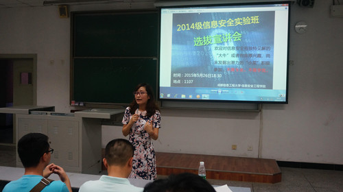 5月26日,信息安全工程学院2014级信息安全实验班选拔宣讲会在1107教室成功召开。参加此次宣讲会的有学院信息安全专业教研室主任吴春旺老师,2014级信息安全实验班班主任王祖俪老师,2014级信息安全实验班辅导员贾茜老师以及为此次实验班的选拔进行技术培训的道格小组成员和所有有志于考入信安实验班的同学们。