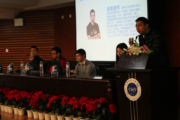 作为成都信息工程学院“首届国家网络安全宣传周”的重要活动之一,由成都信息工程学院信息安全工程学院主办的12月3日“全国网络安全技术对抗赛XCTF成信校园宣讲报告会”,于12月3日在学术报告厅隆重举行。本次宣讲会的“讲师团”包括诸葛建伟(清华大学副研究员,蓝莲花战队领队)、 陈宇森(蓝莲花主力队员,浙大AAA战队发起人)、宋宇昊(keen team高级研究员)、刘世川(腾讯移动安全高级研究员),信息安全工程学院甘刚、吴震老师以及三叶草科技团队以及来自全院热爱网络安全技术的同学参加了宣讲会。