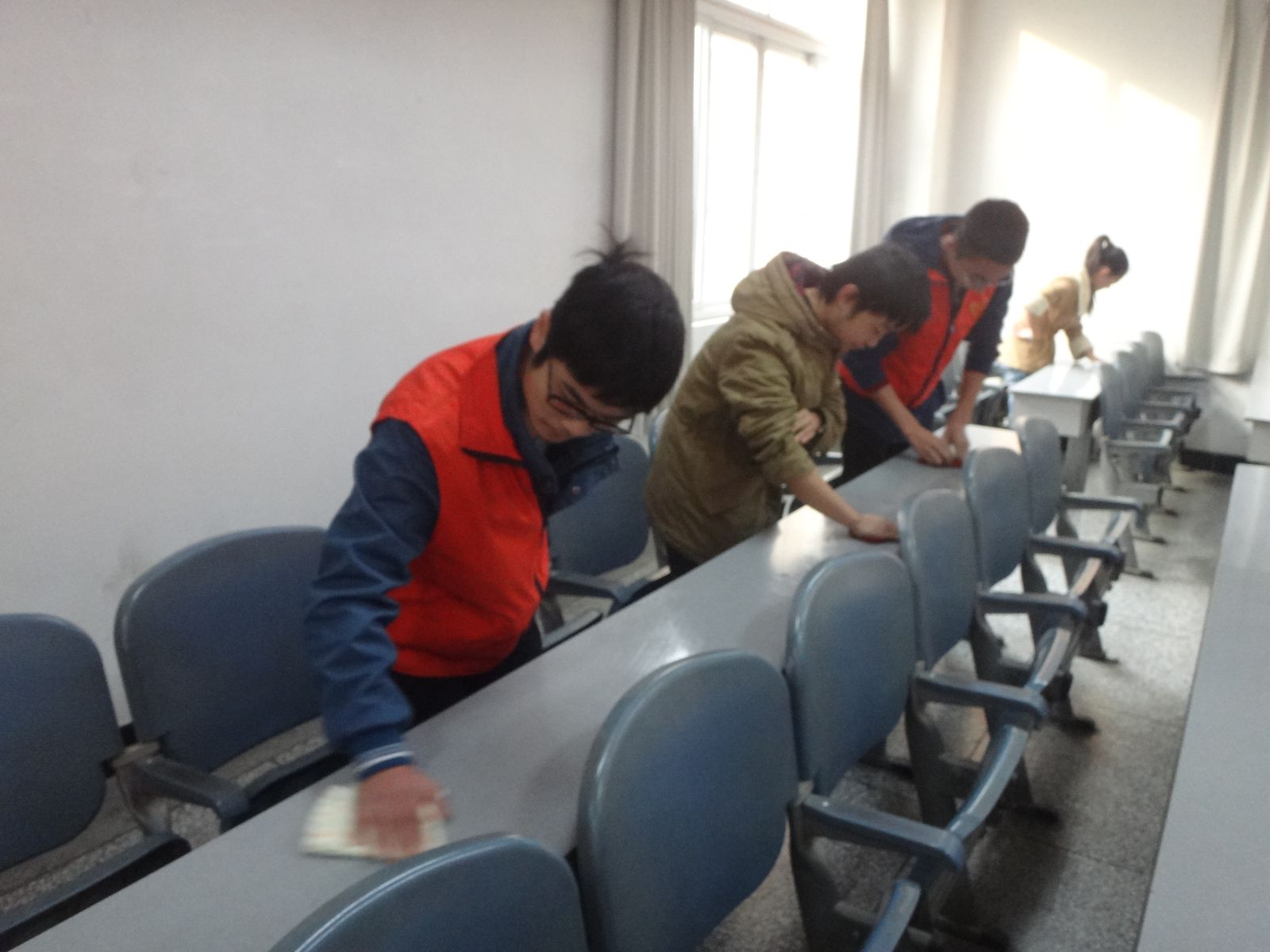 活动中,志愿者分成两组,分别对第一教学楼的一层和二层的每个教室进行了清理。虽然手被冻得通红,但志愿者们仍积极地工作着,将课桌上的污渍擦干净。活动中志愿者们不仅感受到了清洁阿姨们的辛苦,也明白了爱护公物必须从身边的细节做起。