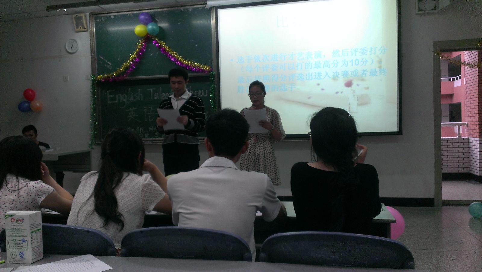 校园英语风采大赛,打破常规的活动形式,充分使用英语的优越性,融入多元化的节目。网络工程学院、计算机学院、外国语学院选手们齐聚在教室,歌曲、演讲、相声、电影原声重现等等络绎不绝的精彩节目。经过层层选拔,华雯丽组、江心怡组等十组选手成功晋级决赛。原音重现现场,淹没现场的汉语交流,处于一个充满英语回音的海洋。现场的欢笑鼓掌声给了付出辛苦的选手们完美的答案。