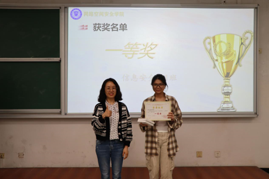 经过激烈角逐,最终评选出6个获奖班级,获奖名单如下,一等奖:信安221;二等奖:信安234班、网工222班;三等奖:网安221、网安222班、物联网221班、网安234班。颁奖典礼上,员工科副科长贾茜老师为获奖班级颁奖,以表彰他们在比赛中的出色表现。