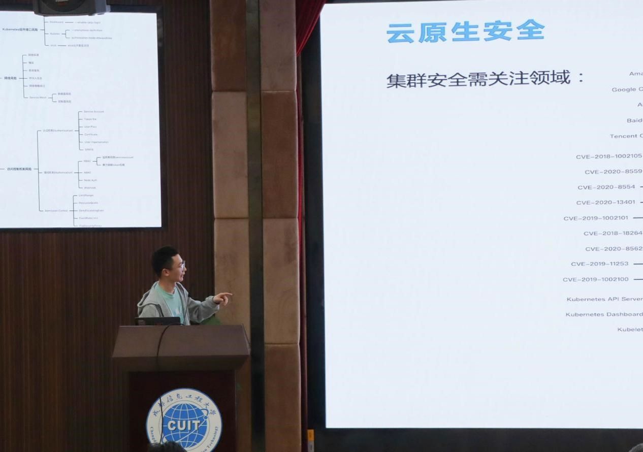 第三位演讲嘉宾是百度安全高级安全工程师张金豪,他为同学们分享主题是“未知攻焉知防-云安全那些事”,从甲方安全运营介绍到云原生安全发展、云原生安全基础到云上安全配置,用庞大的知识储备、丰富的实战经验为在校老员工指明方向。