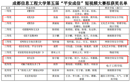此次学院初赛三个获奖作品均在校级比赛中获得一等奖和三等奖(二项)。其中,张磊主创的《亮光》作品获得一等奖,邹梓越和徐宇聪主创的《网络安全知识普及》和《归正》作品获得三等奖。