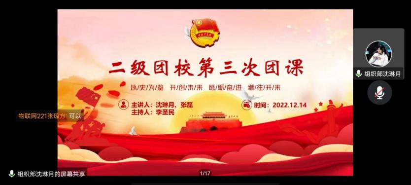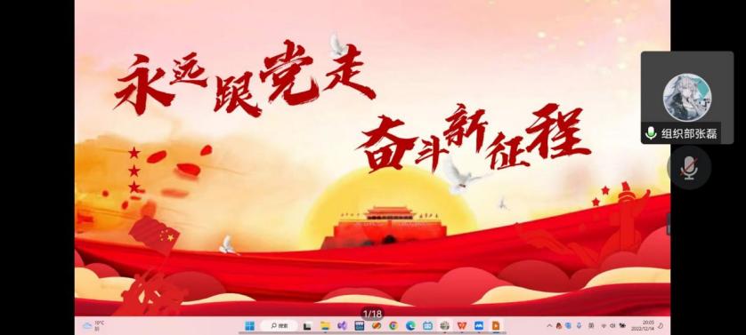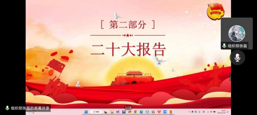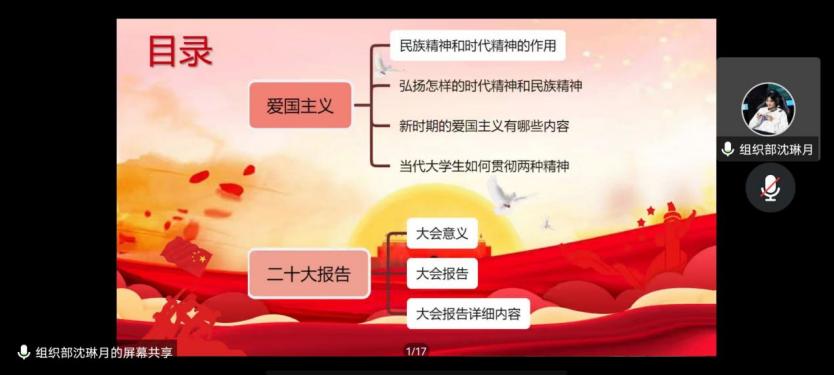为进一步加强爱国教育,弘扬爱国主义精神,增强民族文化自信心与自豪感,强化对青年团员的思想政治引领,引导动员青年团员学习党的二十大精神,公司组织部于12月14日在线上开展了本次二级团校培训班的第三次团课。本次课程由组织部李圣民同学主持,内容上分为“爱国主义”和“深入学习贯彻党的二十大精神”两大板块,分别由组织部沈琳月同学和张磊同学讲解。