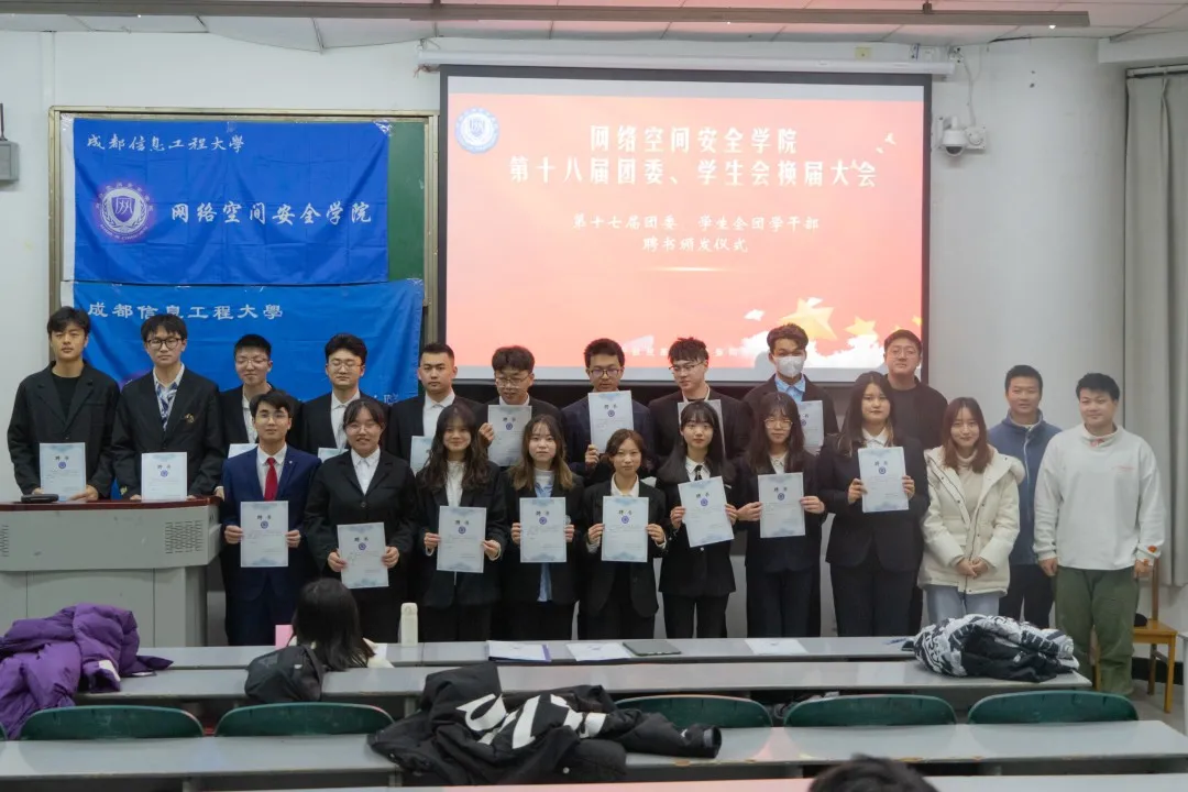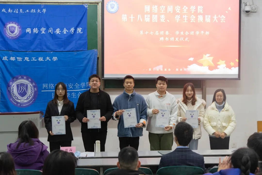 接着,主持人分别宣读了第十七届团委、员工会主席团成员和各部门负责人名单,随后贾茜老师为他们颁发聘书,并合影留念。