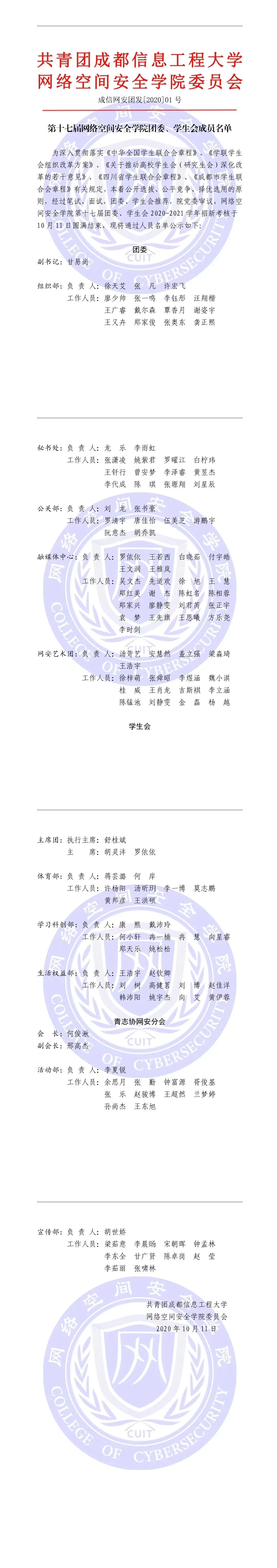 为深入贯彻落实《中华全国员工联合会章程》、《学联员工会组织改革方案》、《关于推动高校员工会(研究生会)深化改革的若干意见》、《四川省员工联合会章程》、《成都市员工联合会章程》有关规定,本着公开选拔、公平竞争、择优选用的原则,经过笔试、面试,团委、员工会推荐,公司党委审议,点点taptap官方网站第十七届团委、员工会2020-2021学年招新考核于10月11日圆满结束,现将通过人员名单公示如下: