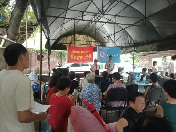 在宣讲现场,小分队的志愿者们有序组织小区居民参加活动,帮助社区发放创文资料并协助进行创文宣讲。