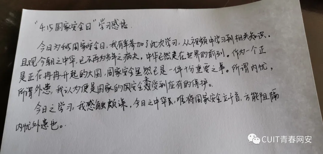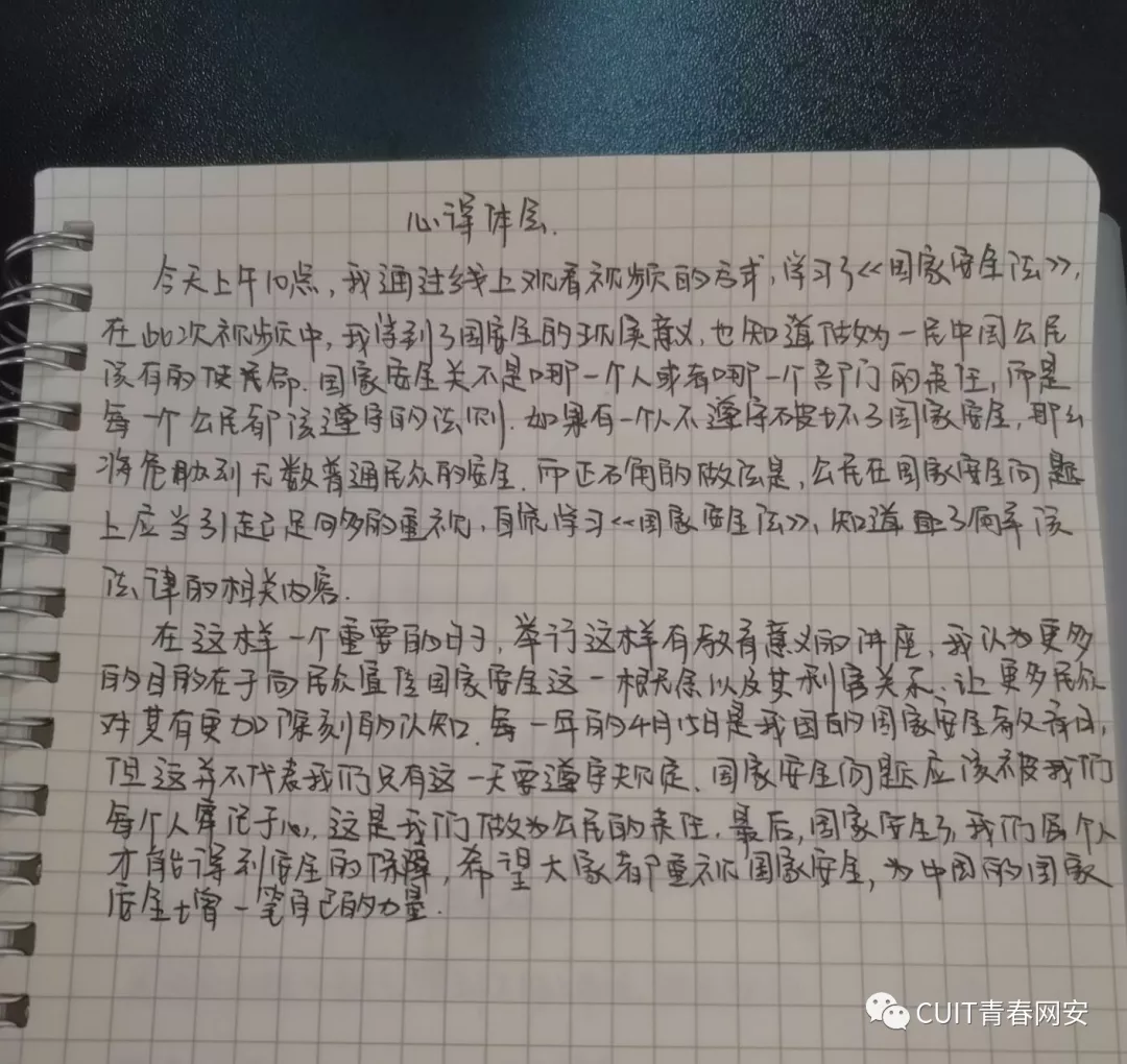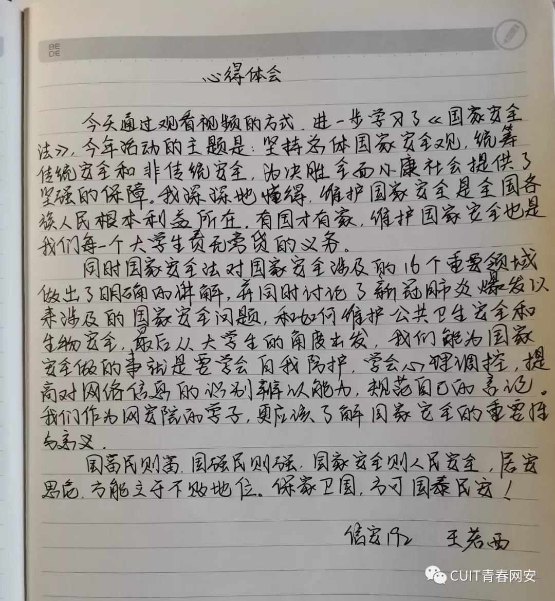 为推动国家安全教育进课堂,教育部组织录制了 2020 年全民国家安全教育日公开课,网安学子积极参与观看了此次课程。安安挑选了部分同学的心得,让我们看看TA们怎么说吧!