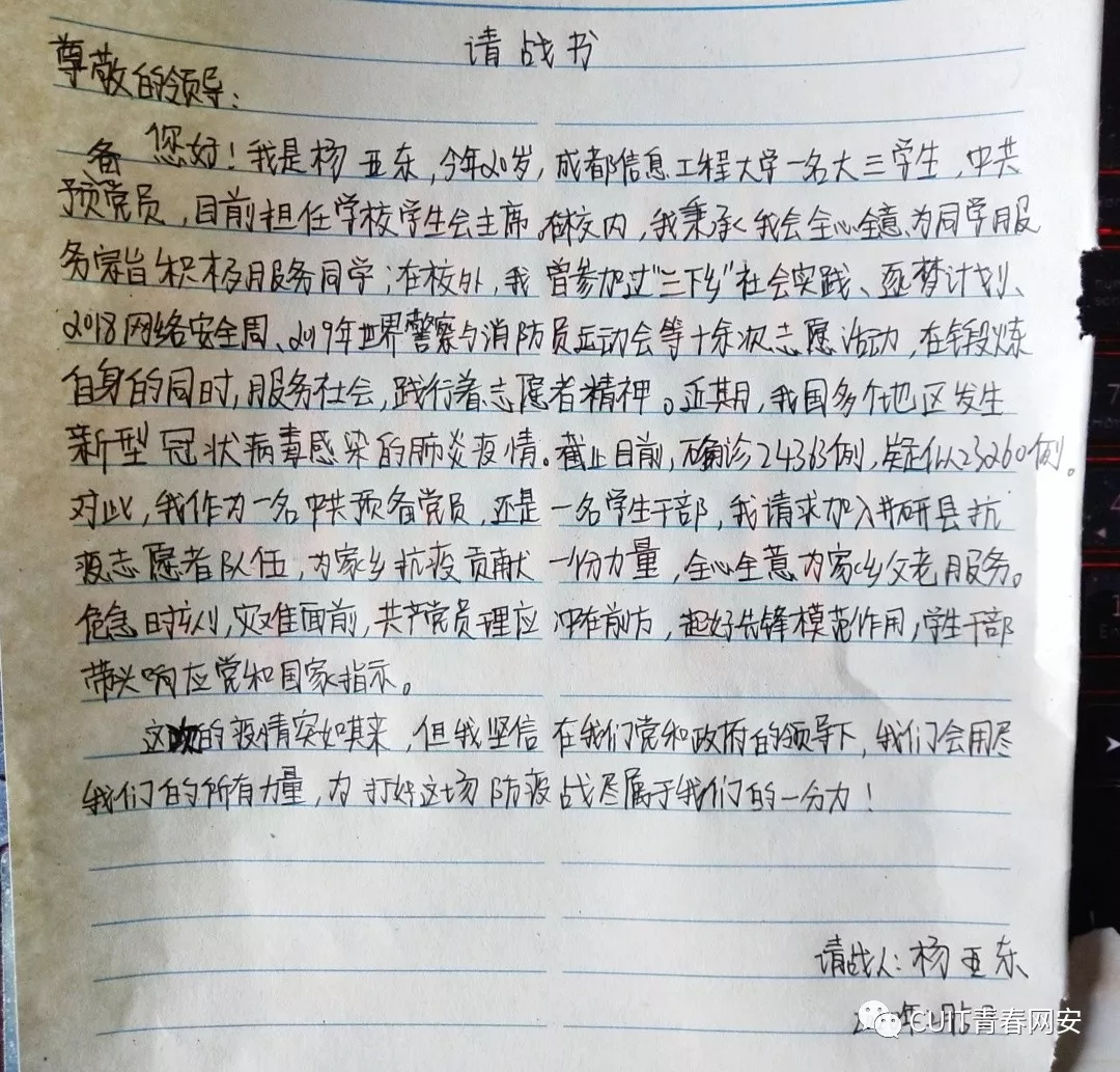 杨亚东,男,20岁,中共预备党员,现为校员工会副主席,信息安全172班班长,2018年度青春榜样“十佳班长”、“自强之星”获得者。我国多个地区发生新型冠状病毒感染的肺炎疫情后,他写下请战书,积极主动报名,成为井研县第一批防疫志愿者,为家乡父老服务。主要工作为协助四川省井研县研城镇防疫工作人员,开展秩序维护、文明劝导等工作。