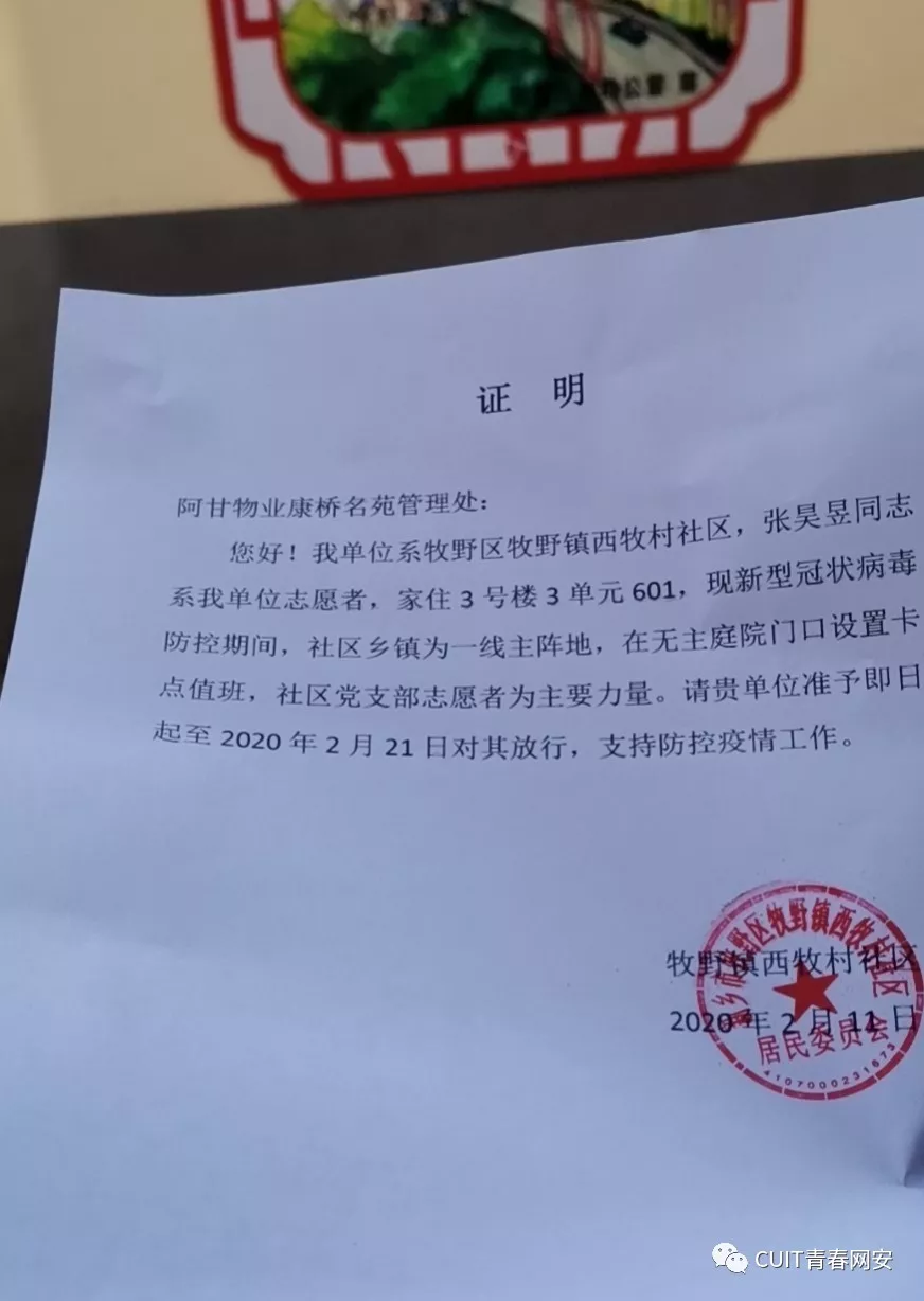 张昊昱,男,信息安全专业信安实验181班预备党员,于寒假期间作为党员志愿者在河南省新乡市牧野区西牧村社区支援防疫一线:帮助社区工作人员登记出入信息、在社区帮助工作人员进行消杀工作。