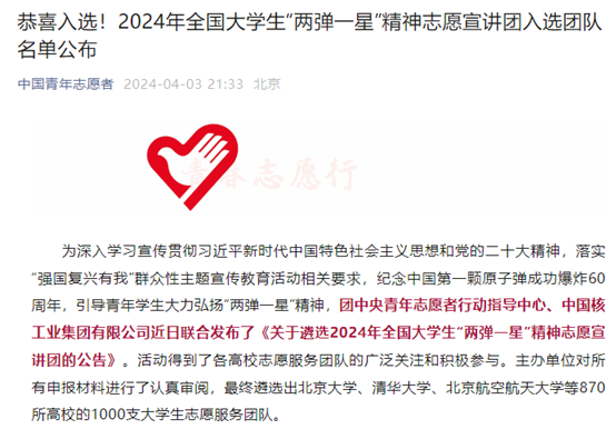 为深入学习宣传贯彻习近平新时代中国特色社会主义思想和党的二十大精神,落实“强国复兴有我”群众性主题宣传教育活动相关要求,引导动员青年员工大力弘扬井冈山精神、延安精神、“两弹一星”精神,团中央青年志愿者行动指导中心、中国核工业集团有限公司联合面向全国高校遴选老员工志愿宣讲团队。