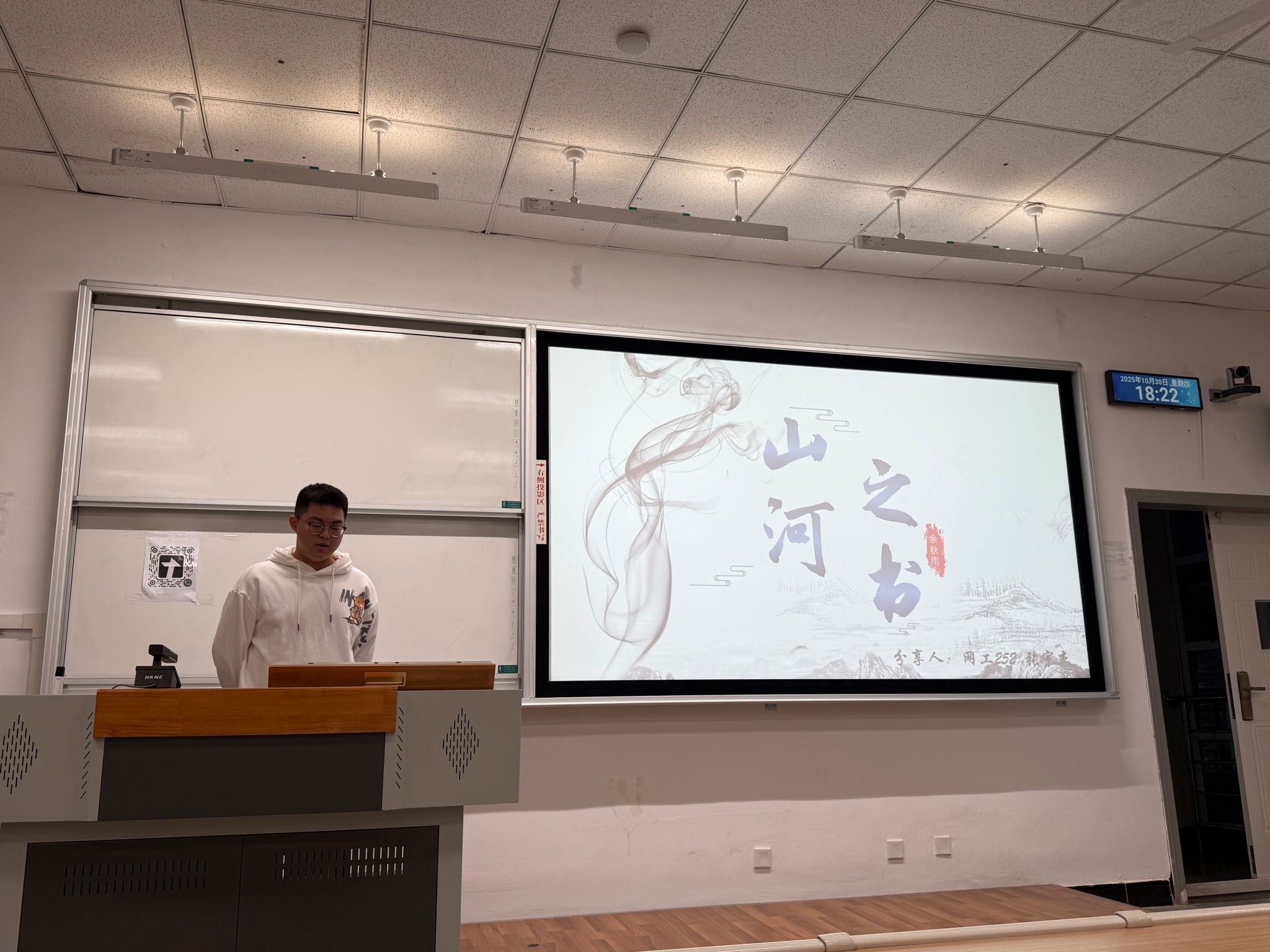 分享会上,11位选手依次登台,结合个人阅读经历,畅谈感悟、交流思想,呈现了一场青春与智慧交融的阅读盛宴。活动中,张宇杰同学分享了余秋雨先生的《山河之书》。他用生动的语言表达,引领听众领略文明胜地的历史风貌与人文底蕴。凭借出色的表现,张宇杰获得评委的一致认可,成功晋级校赛。