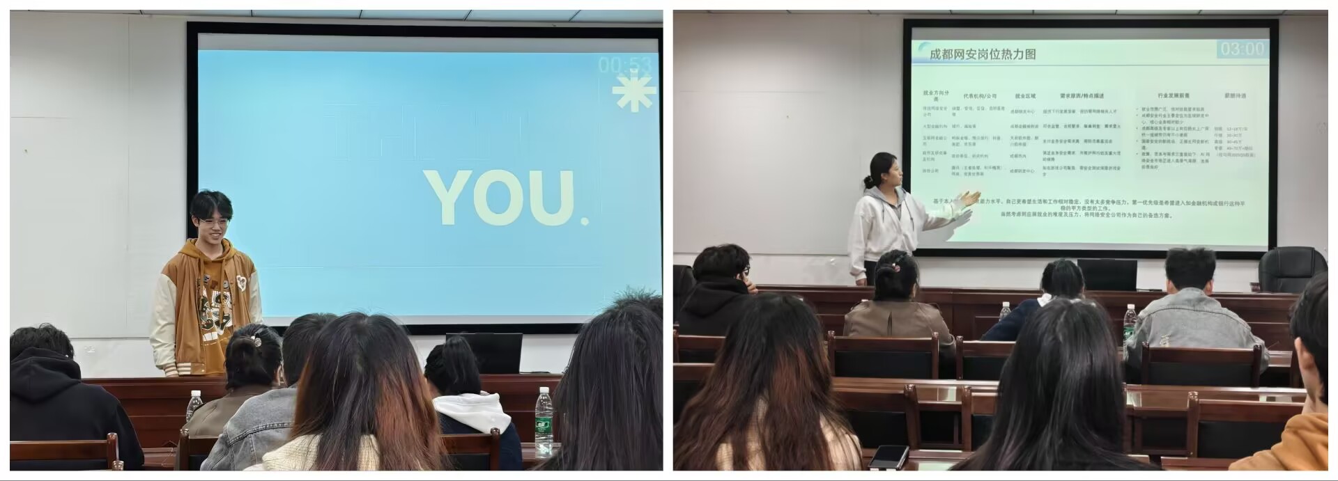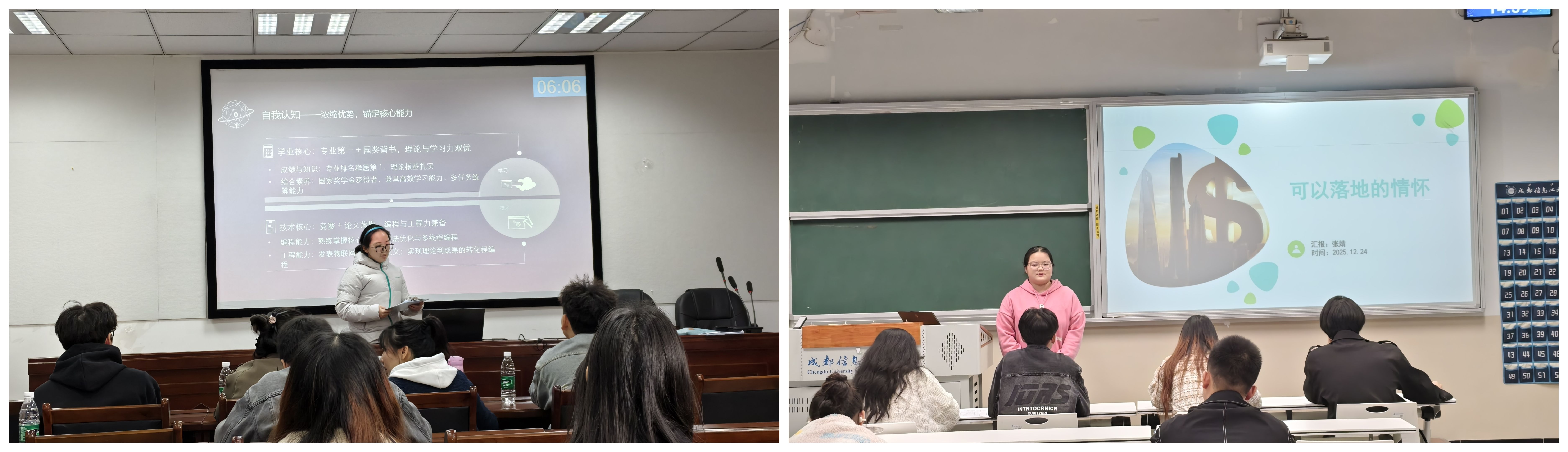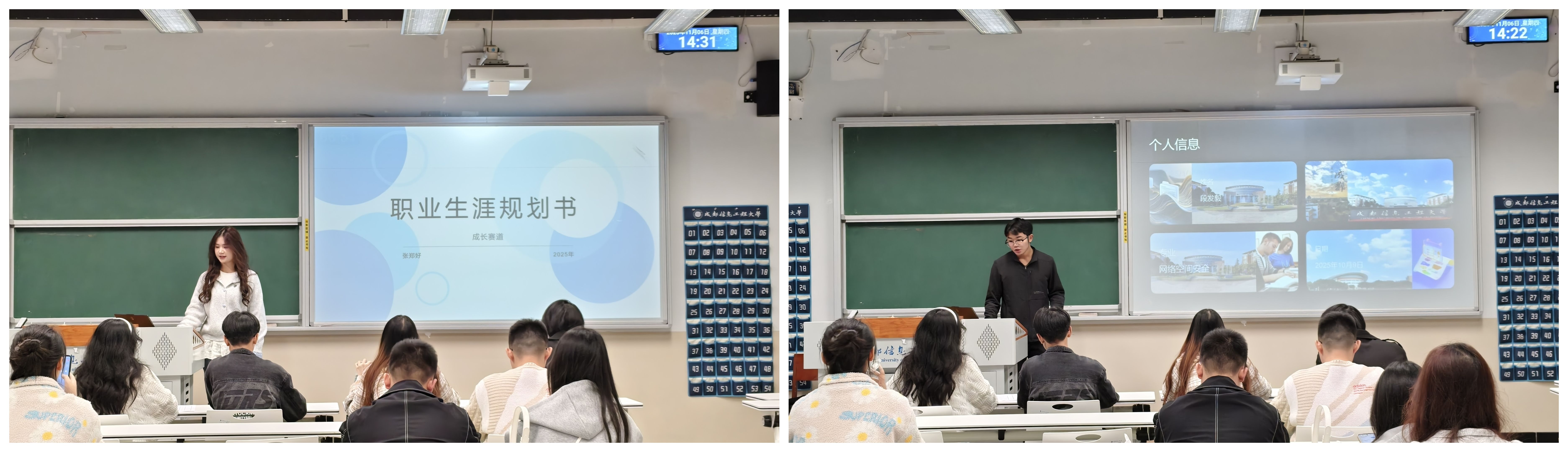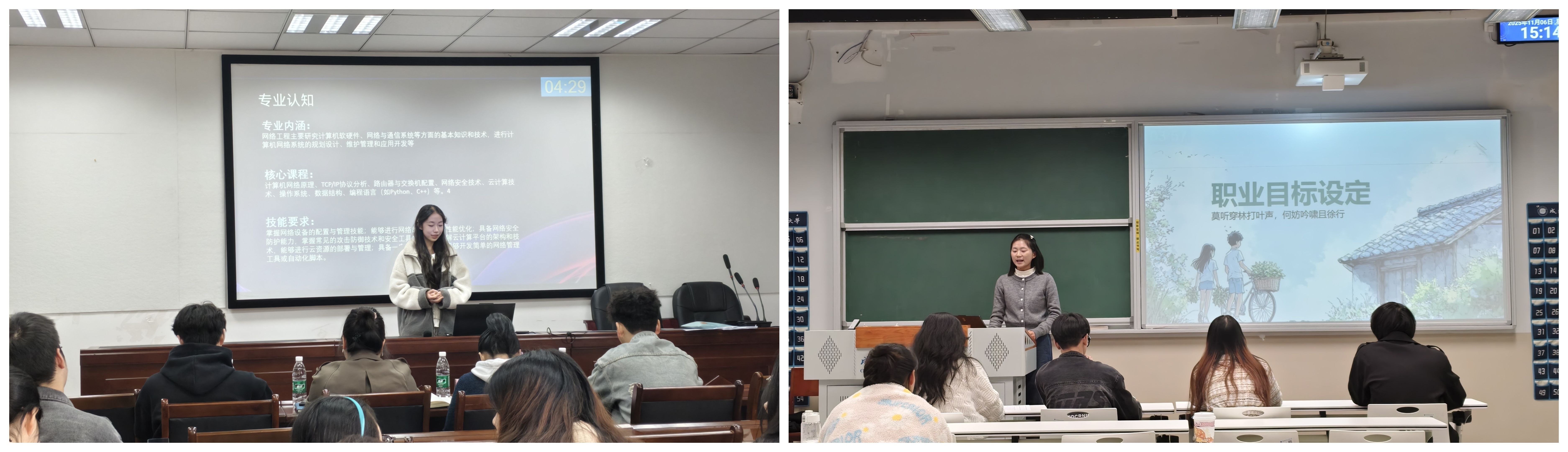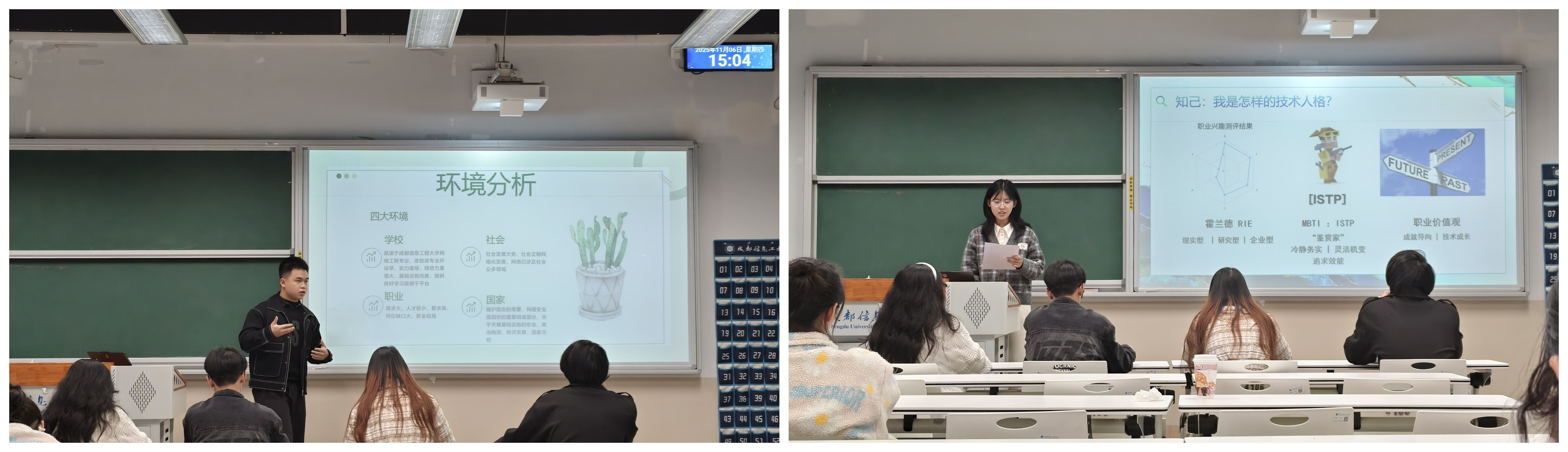 比赛中,选手们围绕自我认知、职业认知、职业目标、行动计划等核心维度,呈现了各具特色的职业规划方案。通过PPT展示与现场答辩相结合的方式,他们系统阐述了个人职业目标与发展路径,展现出清晰的逻辑思维、扎实的调研能力和对未来发展的深入思考。