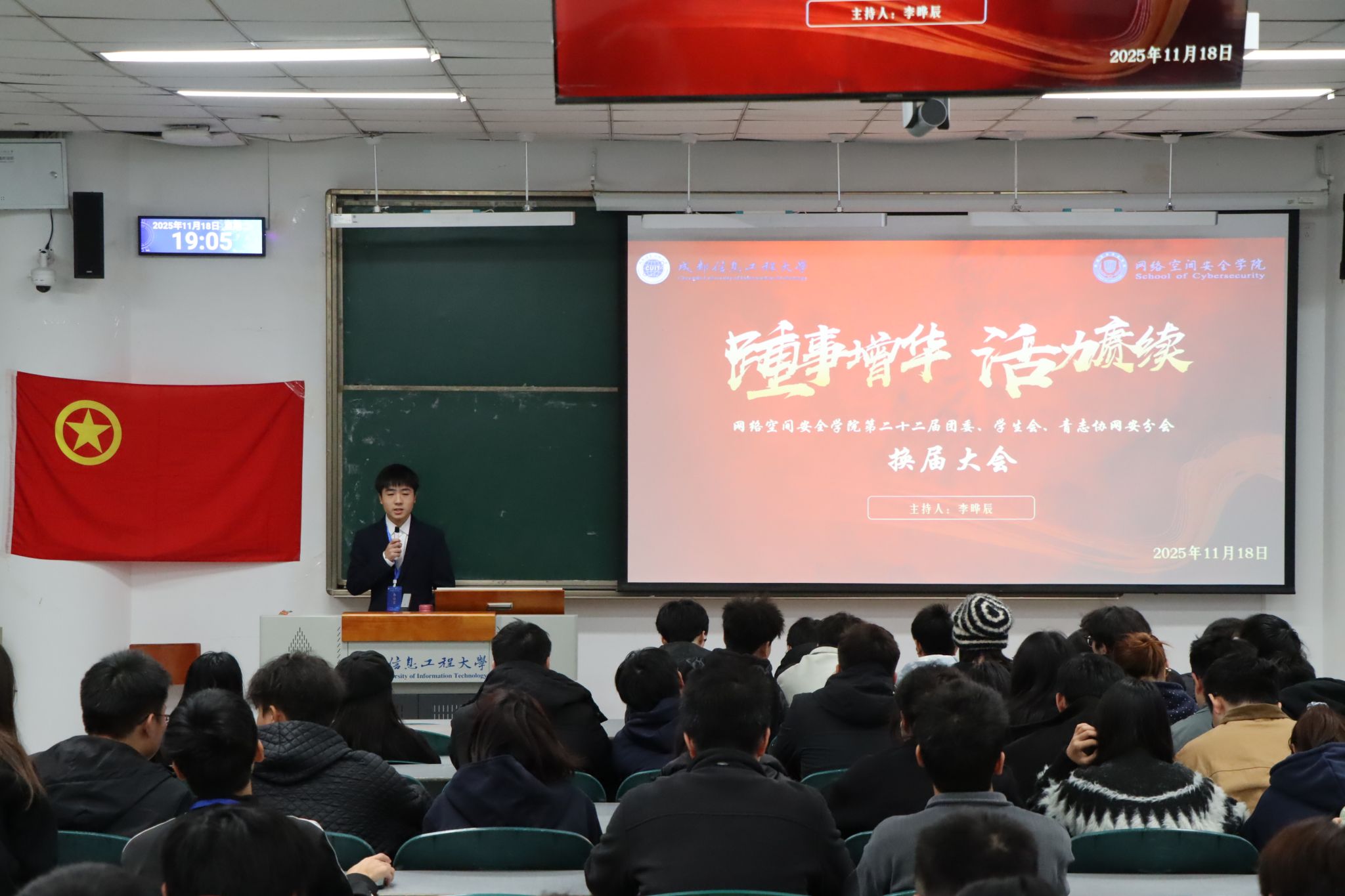 11月18日晚19:00,点点taptap官方网站第二十二届团委、员工会、青志协网安分会换届大会在第四教学楼举行。本次大会由学院团委办公室组织筹备,李辰晔主持。学院团委书记夏焜、助管老师何媛、第二十一届团委、员工会、青志协分会主席团成员、各部门负责人以及第二十二届团委、员工会、青志协分会全体成员参加大会。